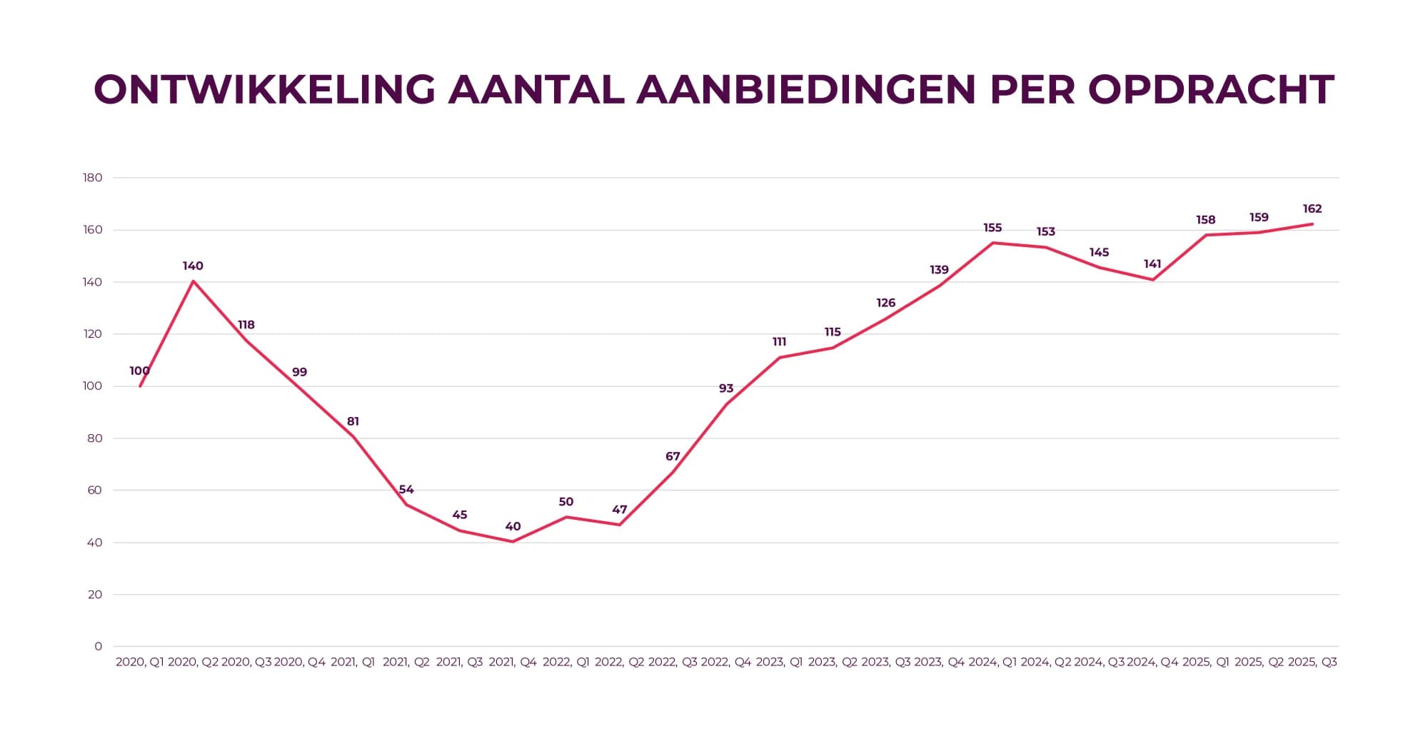 Vrijwel elke opdracht ontvangt vandaag de dag reacties. Opdrachten zonder inschrijvingen komen nauwelijks nog voor. Het aantal biedingen per opdracht ligt op dit moment zelfs vier keer hoger dan op het dieptepunt tijdens de coronapandemie.