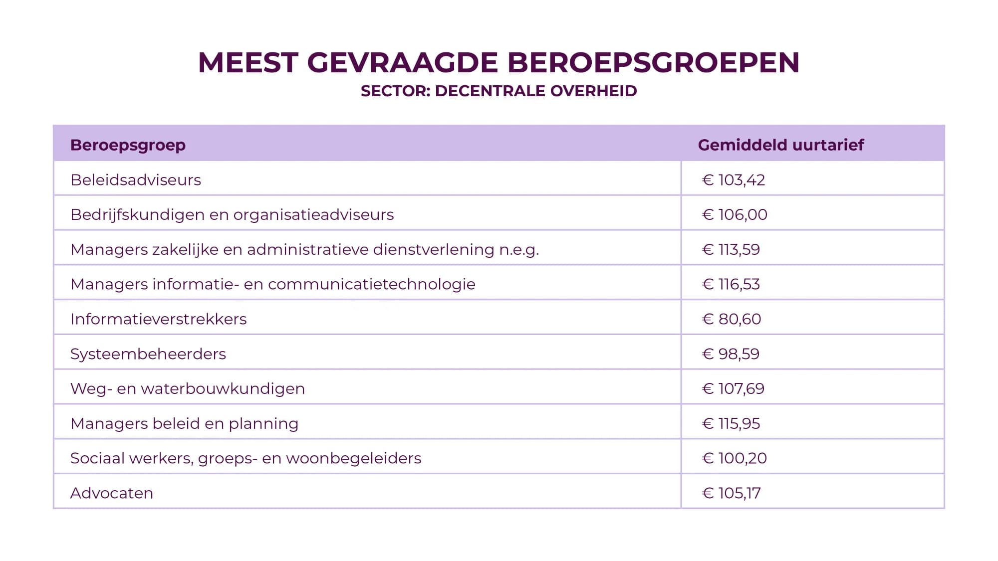 Whereas the central government mainly has structurally high rates for IT and policy profiles, the local government offers a broader range of positions, from policy advisors and organizational consultants to social workers and technical specialists. This difference in profile mix and focus on local policy and implementation also partly determines the variation in hourly rates and fluctuating demand.