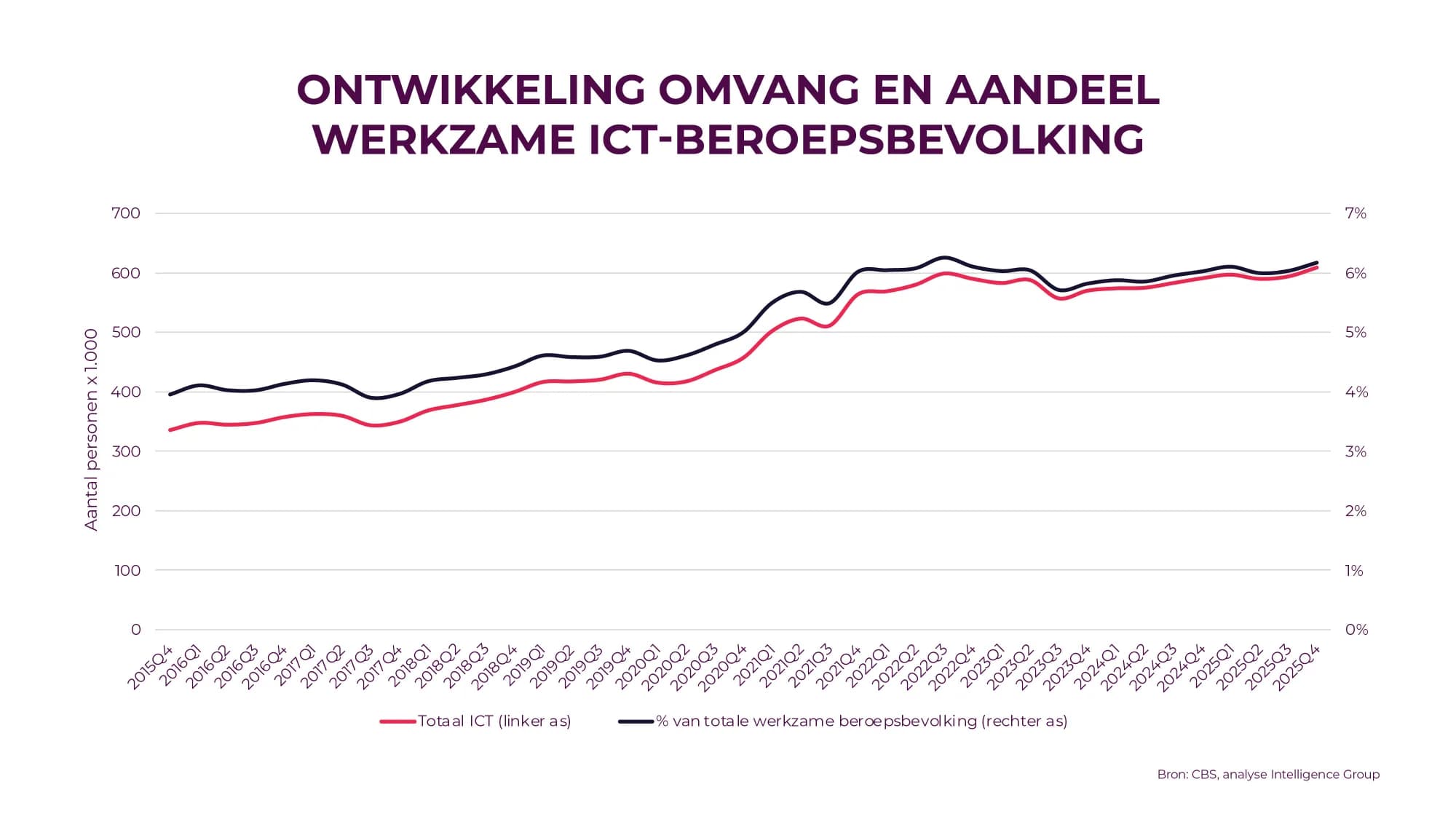 The Dutch ICT sector reached a milestone in the fourth quarter of 2025. The number of ICT professionals rose to 609,000, accounting for 6% of the total working population. This threshold of more than 600,000 professionals marks a significant moment in the sector’s development.