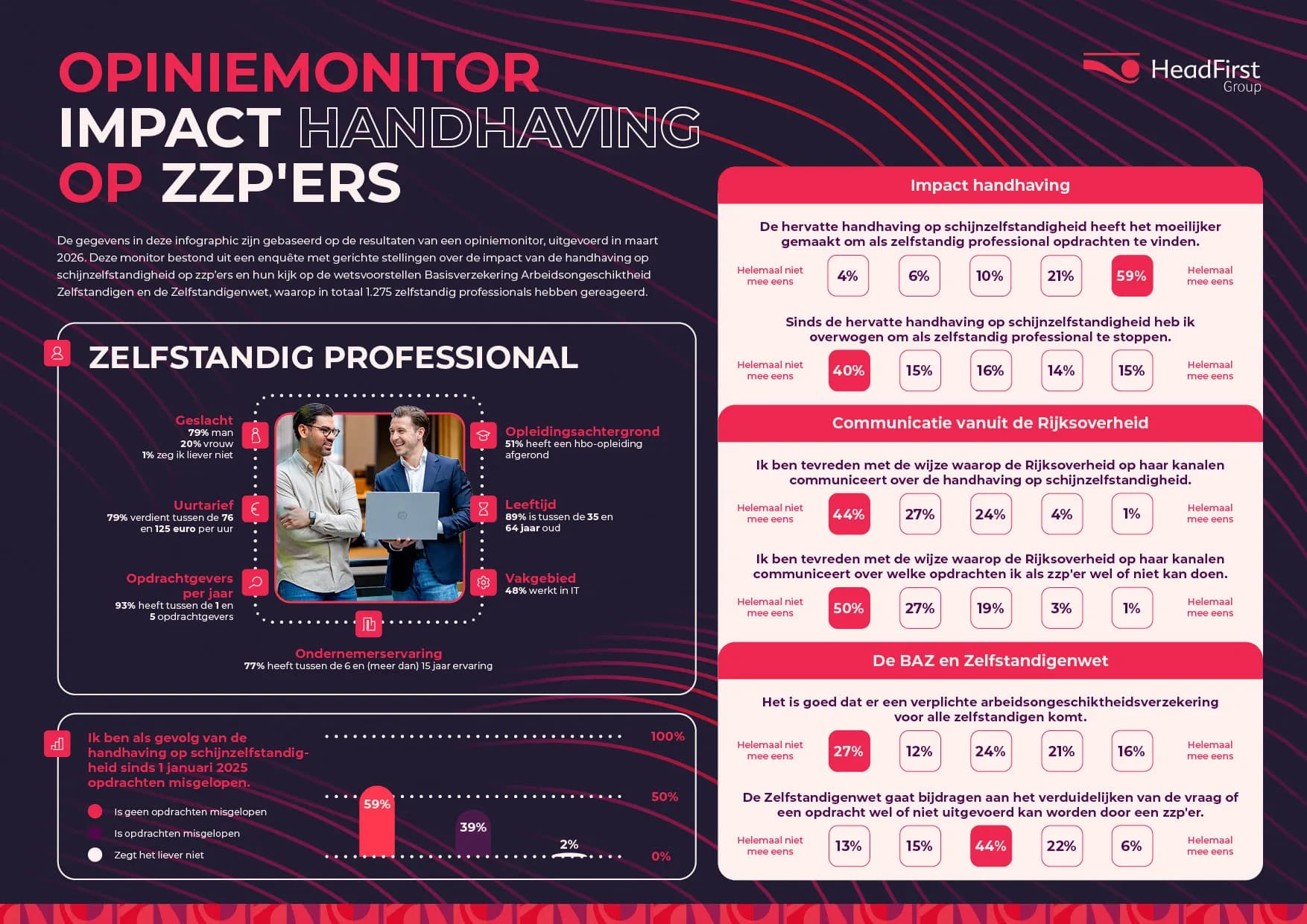 Sem Overduin, Manager of Public Affairs & Public Policy at HeadFirst Group: “The results paint a clear picture of the sentiment among highly educated self-employed professionals. Clients are more hesitant to hire self-employed professionals, and that uncertainty directly translates into fewer assignments. At the same time, the opinion survey shows that there is a great need for clear communication from the government, especially at a time when a lot of misinformation is circulating on social media. We call on the government to communicate actively, concretely, and clearly about what is and isn’t possible. With clear information, the market can once again work with independent professionals in full confidence, because in a tight labor market, we desperately need every worker.”
